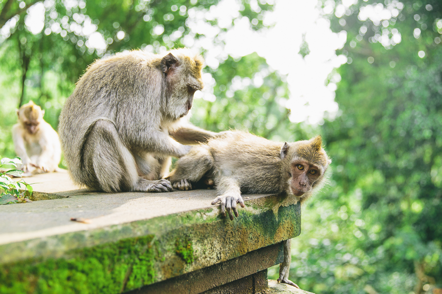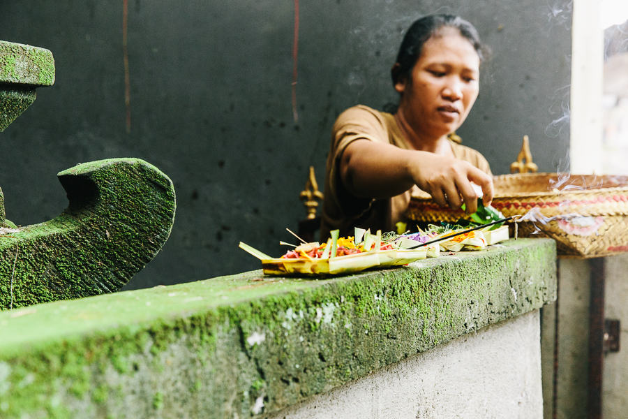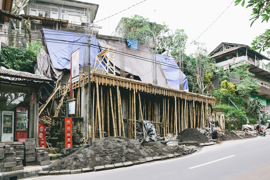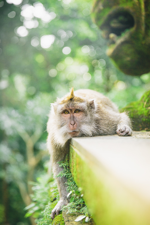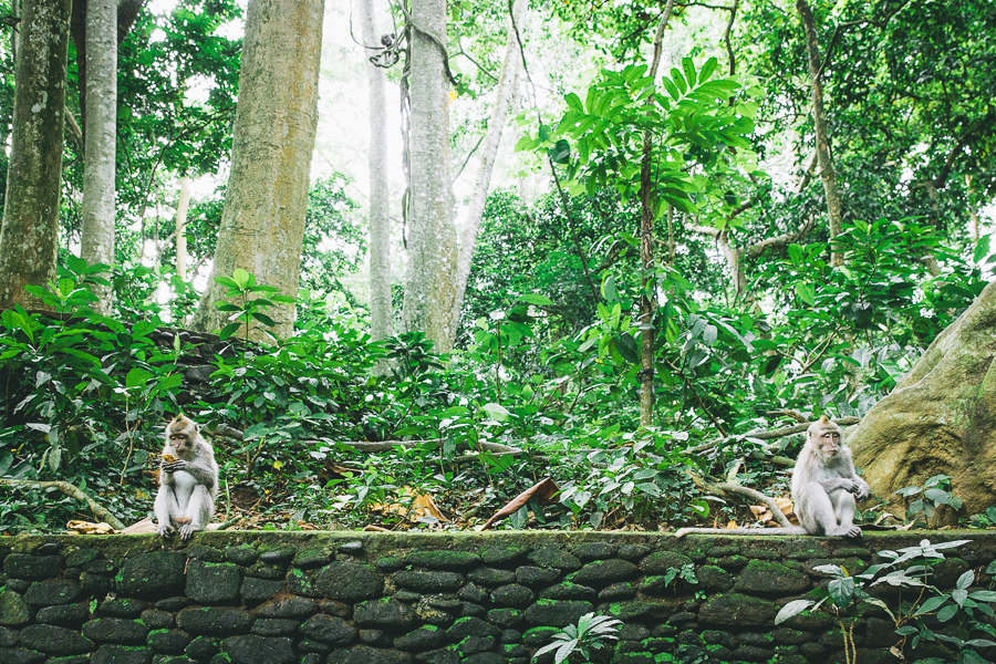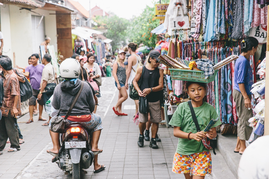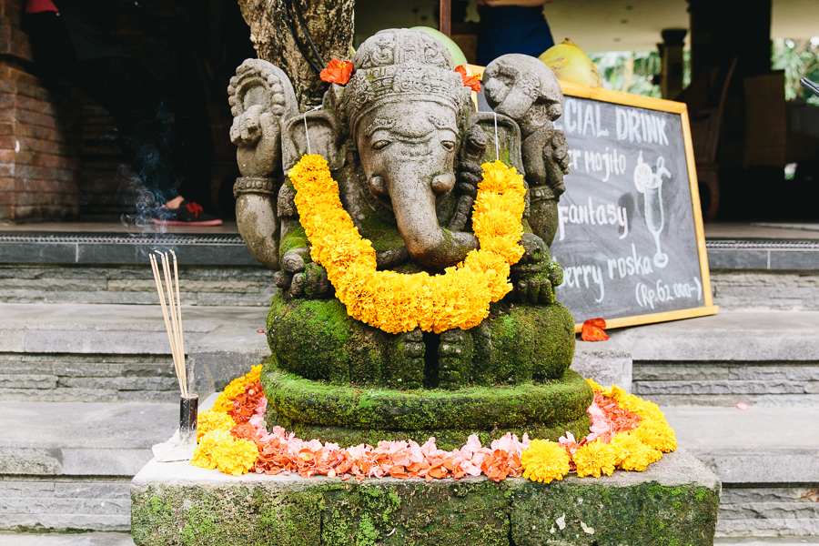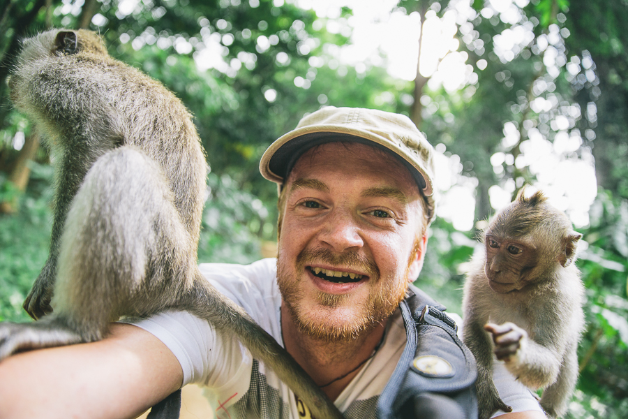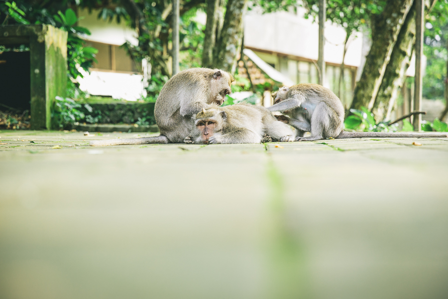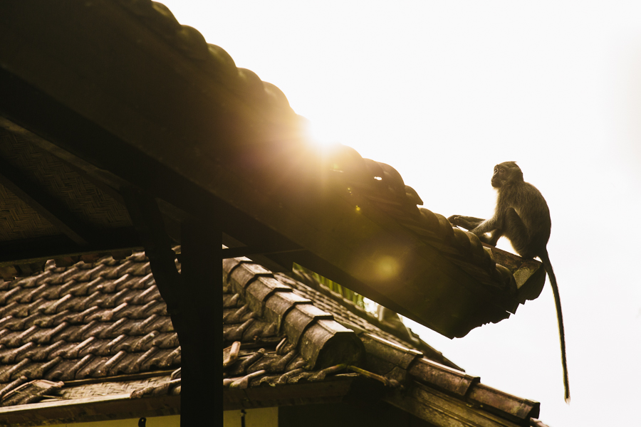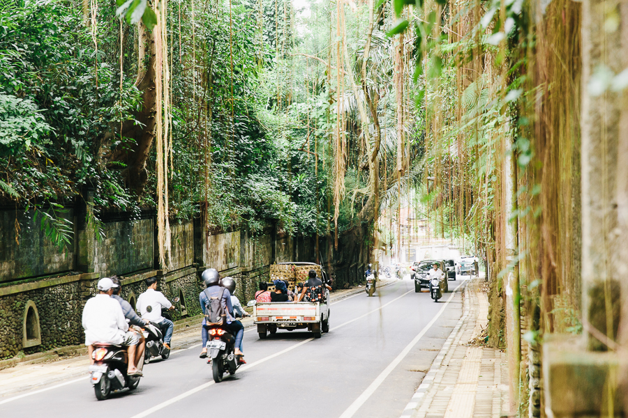 Nachdem mein Sonnenbrandabenteuer in Bingin abgeschlossen war, machte ich mich auf den Weg nach Ubud. Ubud wird oft und gerne als kulturelles Zentrum Balis bezeichnet und befindet sich 50 Kilometer nördlich von Bingin im Innenland. Am Morgen der Abreise hatte ich mich schon früh mit Mul verabredet, der mir angeboten hatte mich mit seinem Roller dorthin zu fahren. Ich war doch erst ein wenig skeptisch, da die Roller recht klein sind, ich ziemlich groß bin und zusätzlich noch meinen großen Reiserucksack plus einen großen Fotorucksack dabei habe. Dann fiel mir aber wieder ein, dass in Asien die Gesetze im Verkehr ja eher Richtlinien oder Vorschläge sind und sowieso jeder fährt, wie er will. Denn nur weil vier Leute auf einem Roller sitzen, heißt das nämlich noch lange nicht, dass drei davon keine SMS schreiben können… So wieder zurück… Somit kam der große vorne in die Fußablage, was unsere Flügelspannweite verdoppelte, der kleinere auf meinen Rücken, und wir machten uns auf den fast zweistündigen Weg.